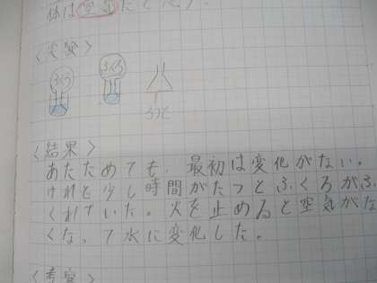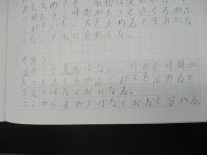 しかし、実験で集めたあわは、冷えると水に変わったことから、あわの正体は水だと考えました。科学的な見方や考え方を身に着けるためには、こういうプロセスが大切です。しっかり学んでいます。
