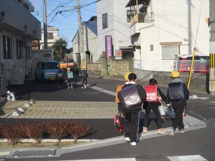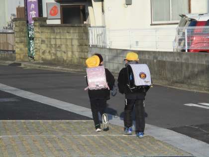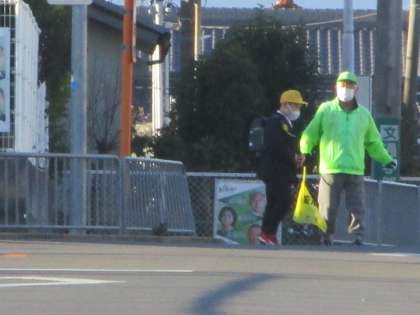 今朝の登校の様子です。日差しはありますが、風があって寒い朝です。