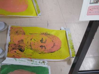 昨日の5年図工の学習です。多色刷りの版画で自画像を作っています。