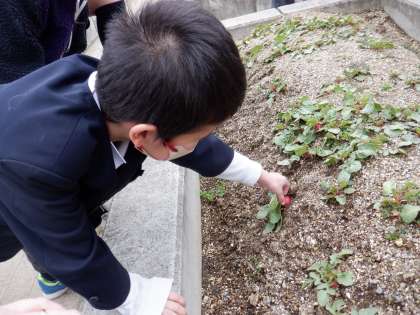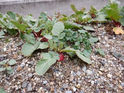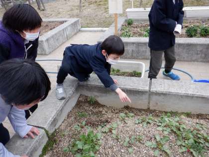 太陽学級の学習園に、赤くて丸いラディッシュが顔をのぞかせました。