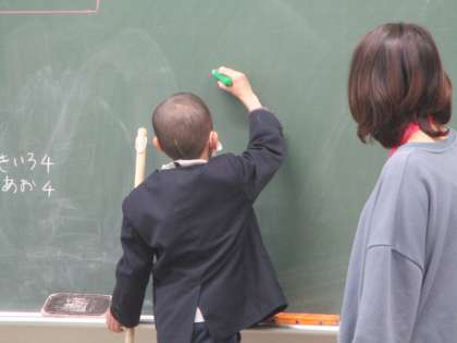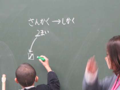 「四角」(正方形)を作るための三角形の並べ方を発表しているところです。操作しながら考えることは、低学年では特に大切な活動です。