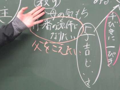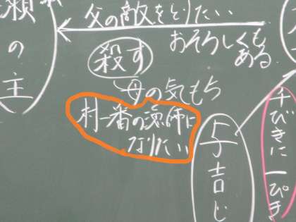 「父のかたきを討ちたい」という思いのさらに奥には、「父を超えたい」という思いがあるのではないか という意見が出ました。太一の心情のとらえが一段深まりました。