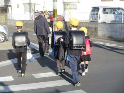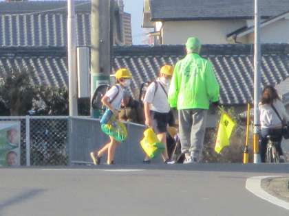 今朝の登校の様子です。日差しは春ですが、風はまだ少し冷たく感じます。