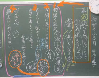 まず、オレンジの□のように単元のめあてを決めました。そのために、1 物語の設定 から大きく4つのことが必要だと話し合いました。2の「疑問に思ったこと」は、同じ疑問を持つ人たちでチームを作り、考えていくことにしました。