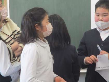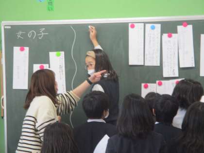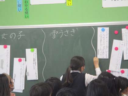 短冊がたくさん出てきたところで、ある人が「登場人物別に場所を決めて貼るように」と呼び掛けています。学習の進め方が身についています。