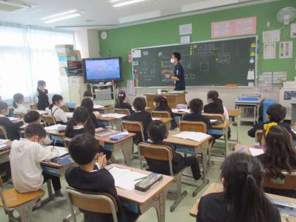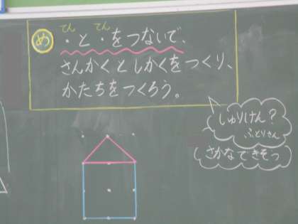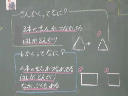 1年算数の学習です。三角形や四角形などの、なじみのある平面図形について学習しています。