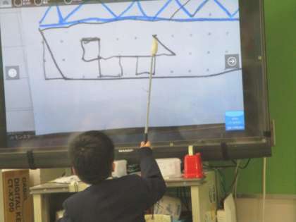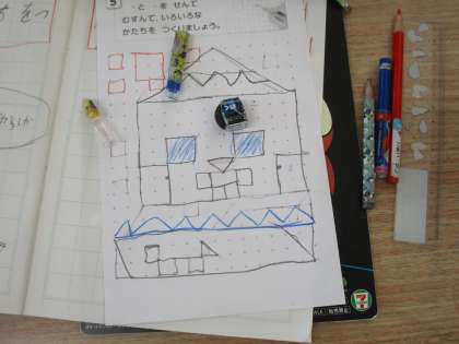 三角形と四角形を組み合わせて「犬」を表しているそうです。ノートには楽しいお話になりそうな世界が、図形で描かれていました。