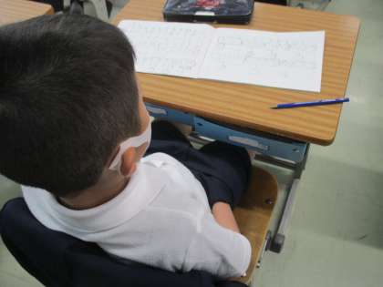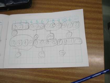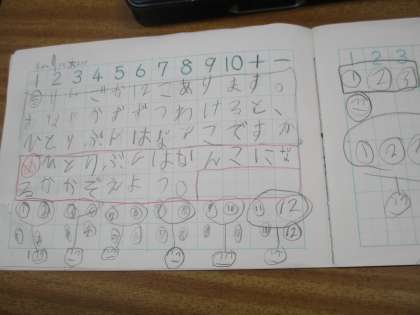 2こずつ、3こずつ、4こずつと1人分の数を増やし、同じ数で分けられると判断した時点で、分けられる人をスマイルマークで表して人数を出しています。