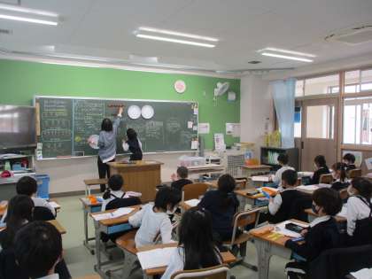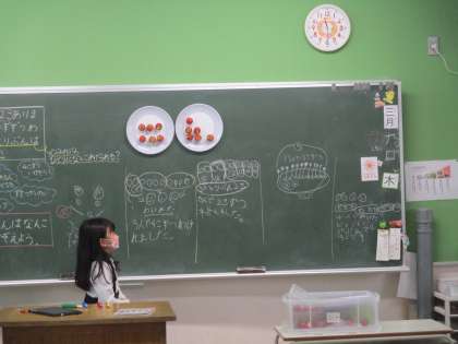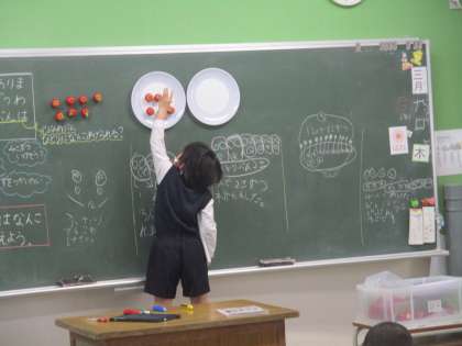考えを黒板で発表しているところです。こういう学習の仕方も身についてきました。