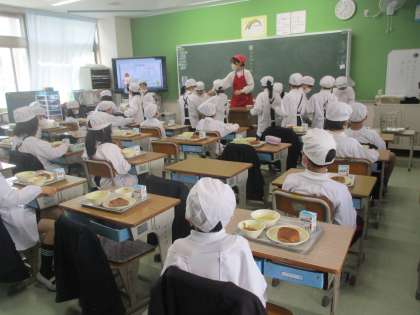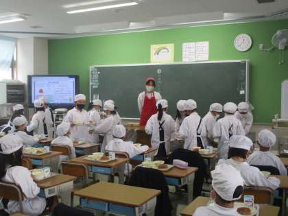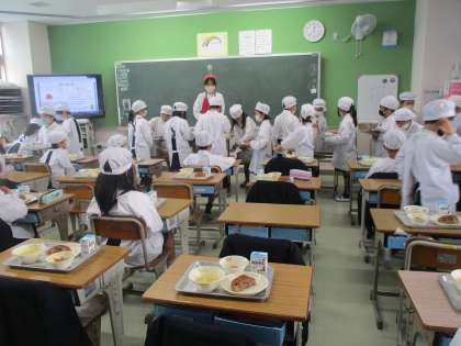 今日を入れて、今年度の給食はあと8回になりました。机もきれいに並び、整然と準備が進んでいます。
