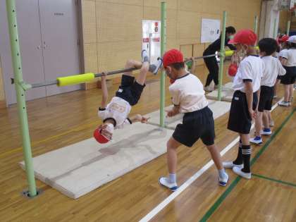 最初は、鉄棒に慣れるためのやさしい動きから始めました。