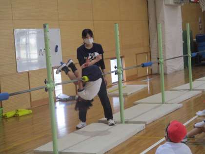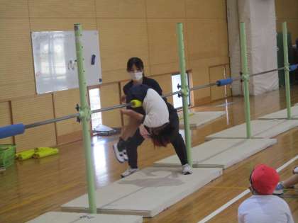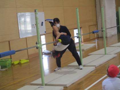 「ふとんほし」での大きな「振り」から、かかえこみ回りの「回る動き」につなげていく感じをお手本で見ているところです。