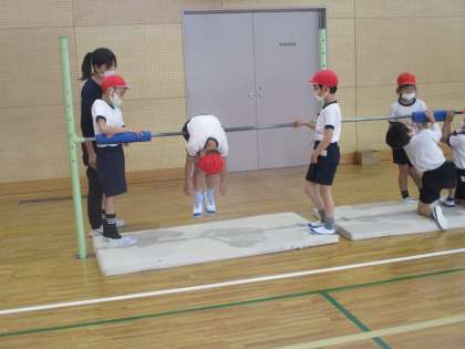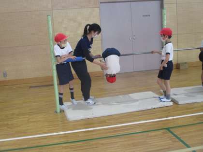 「ふとんほし」で振る感じがつかめるように、補助しているところです。