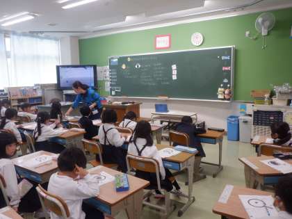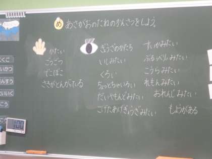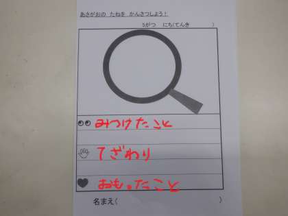 1年生活の学習です。あさがおの種をよく観察して、ワークシートに「みつけたこと」「手ざわり」「思ったこと」を書いています。見て触って、五感を使って観察します。