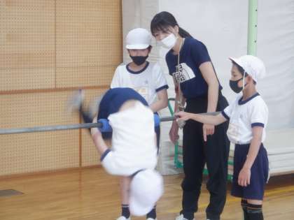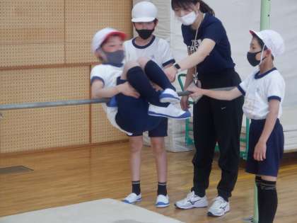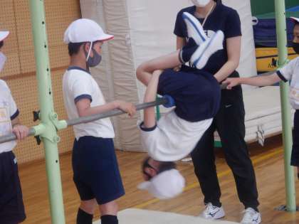 鉄棒「かかえこみ回り」の最終時です。同じチームの仲間への補助や観察にも力が入ります。