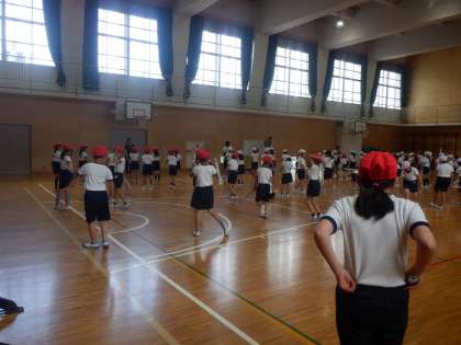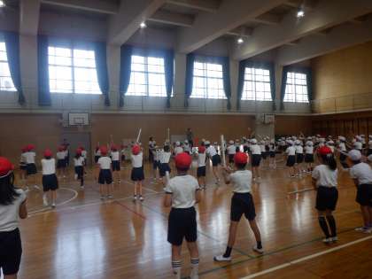 3年の団体演技の練習です。新聞紙を丸めた棒を持っています。