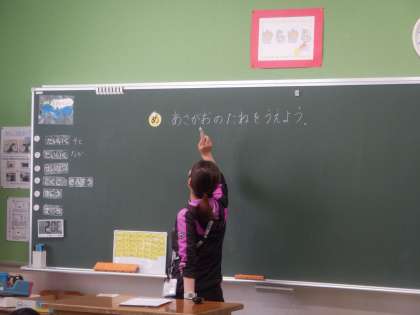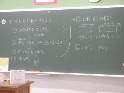 1年生がアサガオの種を植えます。6年生がそのお手伝いをします。