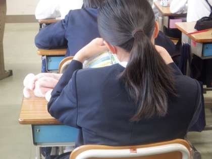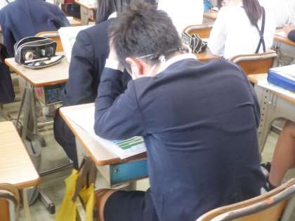 2人の登場人物に対して、手紙を書くという活動です。先生が書いた例文を読んでいるところです。