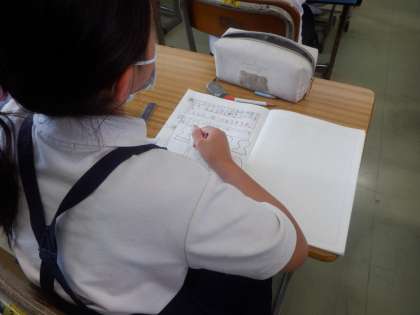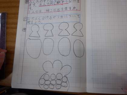 この問題の場面を図に表して、答えを出していきます。4人に分けるので4人の人の形、12個のあめと一人分のあめを入れる袋を描きました。