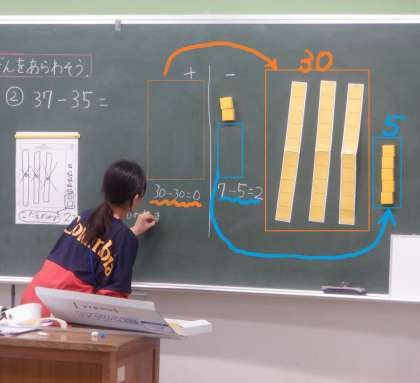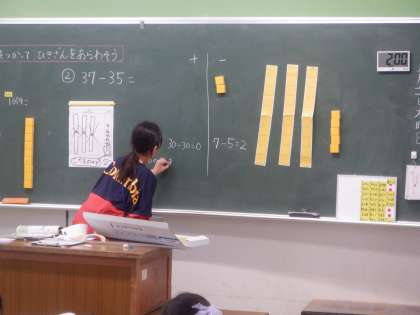 黒板でも、操作したことと、ひっ算としての計算の仕方をつなげて、みんなで確かめました。ていねいに学習を進めています。