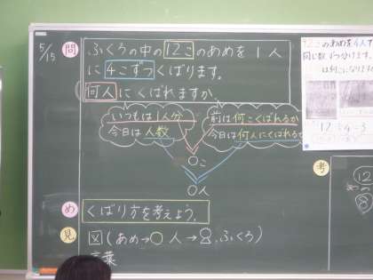 3年算数の学習です。12個のあめを一人に4こずつ分ける場面を考えています。
