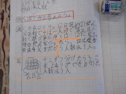 この人も、一人分の数×いくつ分=全部の数 というかけ算の考え方を使っています。答えの「何人」は「いくつ分」にあたるものであることを、きちんととらえています。