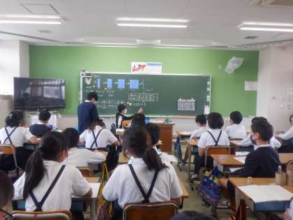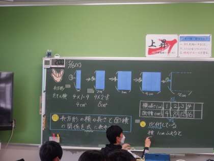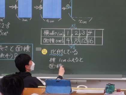 6年算数の学習の様子です。高さ4cmの長方形の横の長さと面積の関係を考えています。