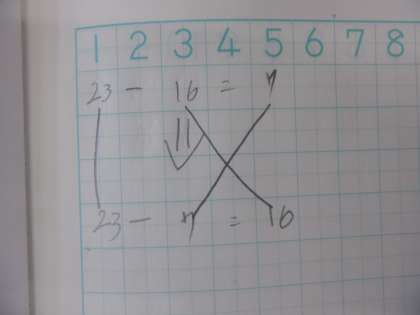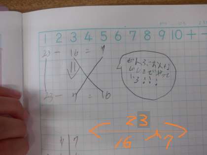 2年4組 算数 ひき算 7 公開日 2023/05/17 更新日 2023/05/17 2年 答えとひく数を入れ替えても、出てくる数字は変わらないことに気づいています。23と16と7の関係が、下の数直線のようになっていることをしっかりとらえています。