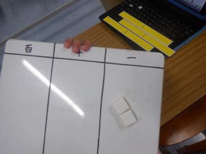 太陽学級 2年算数 ひき算 3 公開日 2023/05/19 更新日 2023/05/19 太陽 学級 このひき算をお買い物の場面で考えました。先生のパソコンをレジに見立てて、−35を「35円払った」ことにしました。すると、残りは2円になりました。