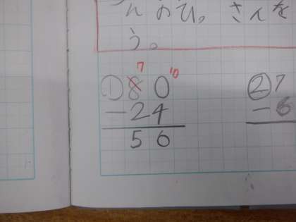 ノートにも、繰り下がりがよくわかるように色を変えて数を書いていますね。