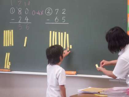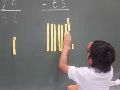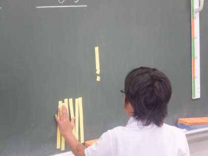 黒板でブロックを動かし、みんなで答えを確かめています。