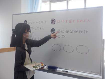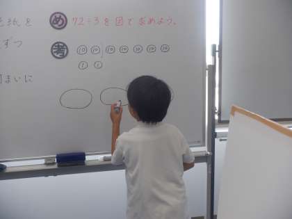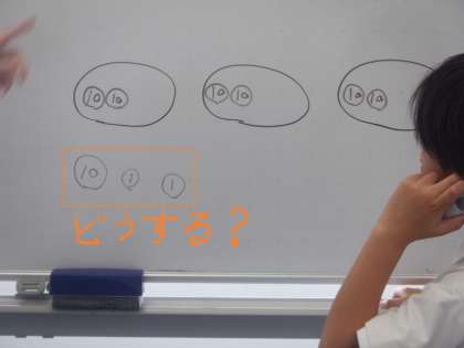次は答えが2けたになるわり算です。九九だけでは答えが出せません。とりあえず、20枚ずつ3人に等分しましたが、残りの1枚をどう分けるかが問題です。