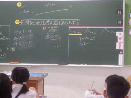 かけ算、ひき算、わり算の3つの方法で答えを求める考え方が黒板に書かれました。