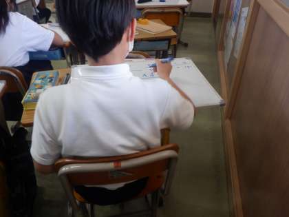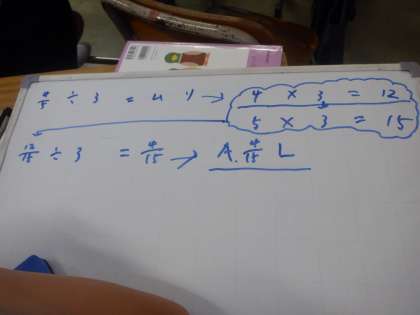 自力解決が始まりました。分数の性質を使って、分子を3で割り切れる数にしてから、3等分する考え方です。