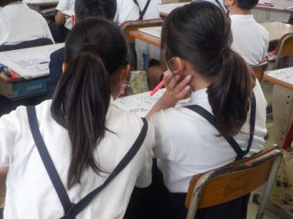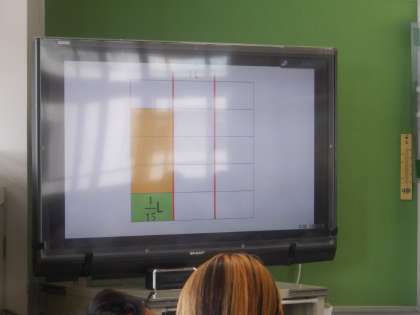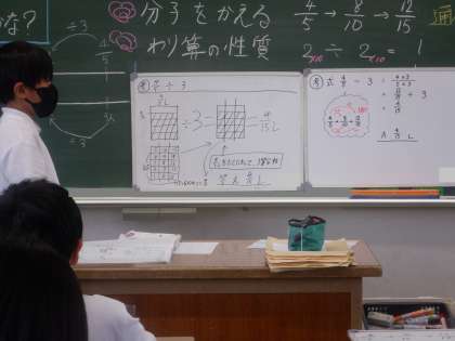 黒板を使っての交流場面です。5分の4の図を縦に分ける方法です。1つ分が15分の1になることをはっきり説明していました。