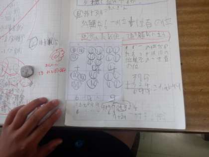 お金の図と、ひっ算の計算の結果を、関連付けようとしています。