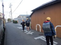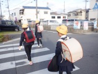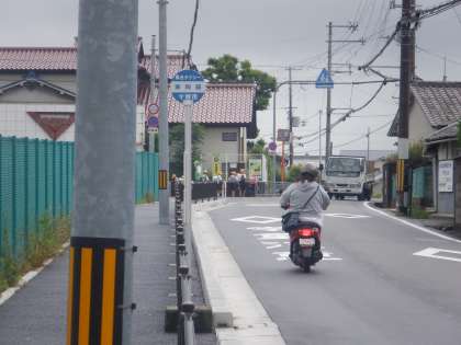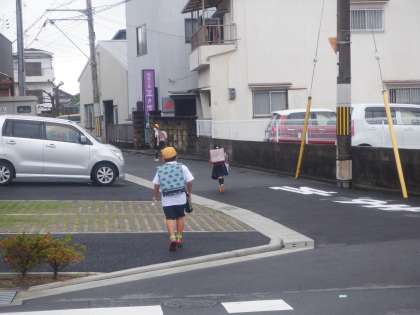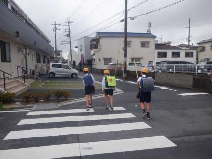 今朝の登校の様子です。夜の間の雨はやんで、曇っています。