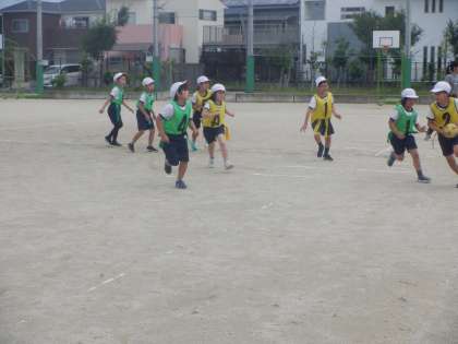黄色チームも負けていません。2番の人が緑の守りを突破してゴールに向かっています。その様子を見た4番の人が、この後ゴールエリアに向かいました。