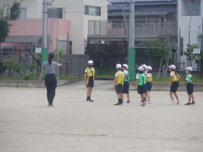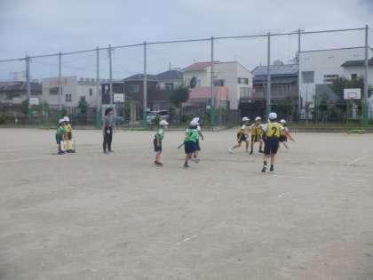 先生はプレーを見ながら、ゲームの状況を知らせて判断を助けたり、よいプレーをほめて印象付けるなど、自分たちで判断してプレーすることを助けています。