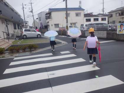 今朝の登校の様子です。今日も雨が降ったりやんだりの天気です。