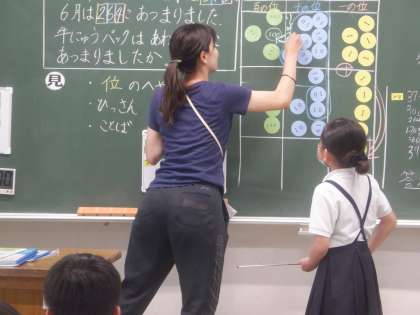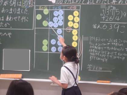 こちらのクラスでも、繰り上がりの場面を説明していました。十の位の計算によって「100」ができることが、「1くり上がる」ということだ というのがよくわかります。