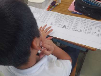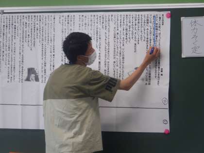 さっそく本文を読んで心情をとらえていきます。「悲しい」などのマイナスの心情には青で、「うれしい」などのプラスの心情には赤で線をひきます。