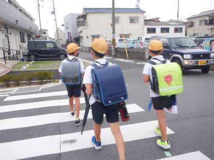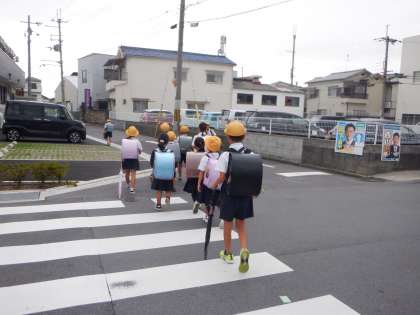 今朝の登校の様子です。雲が空をおおっていて、涼しく感じます。
