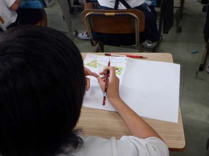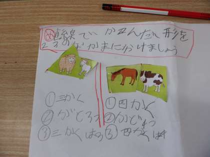 教科書についているさし絵のついた紙を切って、形をもとに分類しました。