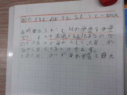 5年3組 社会 水産業 6 公開日 2023/09/11 更新日 2023/09/11 5年 この人は、ノリの養殖にとっての、自然環境の大切さをまとめています。川からくる豊富な栄養分と大きな潮の干満差がノリに適した環境であることをとらえています。
