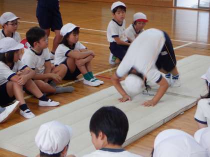 手を遠くにつき、脚を伸ばして大きな「へ」の字で回転を始めていますが・・・