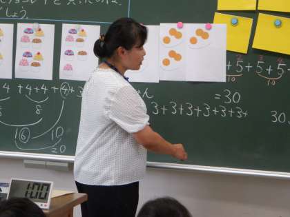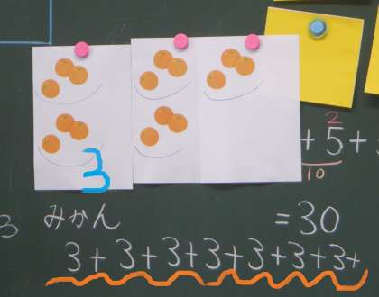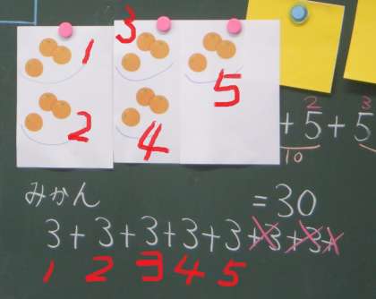 2年2組 算数 8 公開日 2023/09/12 更新日 2023/09/12 2年 1さらあたり3個なので、3をどんどんたすのですが、お皿の数が5枚なので、5回たすのが正しい とみんなは指摘していました。1つ分(3こ)がいくつ分あるのか というかけ算につながる考えをすでにもっています。