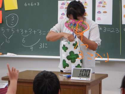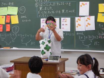 2年2組 算数 11 公開日 2023/09/12 更新日 2023/09/12 2年 このお菓子の数は、左右どちらの数え方になるかを考えています。1セット3個入りが5セットあるので、右側と同じです。1つ分、いくつ分をとらえられるようにしています。