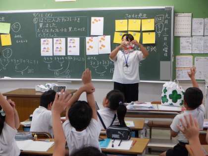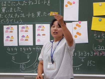 1袋12個入りのチョコレート、1包2個入りのビスケットなど、1つ分といくつ分に自然と考えが向くように、具体物を選んでいました。いよいよ、かけ算の学習が始まります。