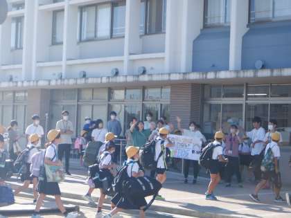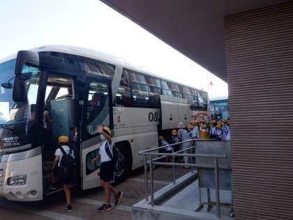 先生や保護者の方に見送られながら、バスに乗り込みます。